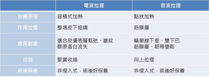 仲夏醫美診所-黃仲立院長表示,電波拉提屬於「容積式加熱」整塊皮下組織,熱能傳導範圍廣而全面,對於皮膚鬆垮或皺紋較多的地方,適合想要緊實肌膚,就像BBQ一樣,肌膚接觸熱能整個緊縮起來,並且刺激膠原蛋白增生;音波拉提則是「點狀加熱」,直接作用於筋膜層,帶動輪廓線向上拉提,對於臉部線條下垂有比較好的效果。