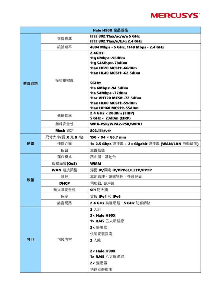 MERCUSYS年度高階旗艦 Halo H90X 極簡外型,適合擺放家中任何一個空間,且為旗下首款具備2.5Gbps高速網路連接埠的產品,機身背後採用WAN / LAN孔自適應設計,即使插錯孔也還是可以讓5GHz與2.4GHz的雙頻Wi-Fi 6速度,輕鬆飆至6000 Mbps,加上MERCUSYS App輕鬆完成佈署Mesh Wi-Fi6網路,2入組即可輕鬆覆蓋高達180坪空間,可說是市場上最經濟實惠的Mesh Wi-Fi6路由器!自 2022年底2入組開賣以來便造成廣大迴響,為了回應更多大坪數消費者對網路覆蓋零死角的需求,MERCUSYS宣布推出3入組,用戶只需要一組Wi-Fi帳號密碼,就可以自由在每個Halo之間無縫使用最適合的網路環境,最高可提供高達150台設備配對連線,還有三年保固、三換新的產品服務,可說是市場上最高CP值的唯一首選!想要馬上體驗無縫漫遊的樂趣,即日起Halo H90X 3入組於線上開賣,建議零售價8,999,超高CP值還不快手刀購入!