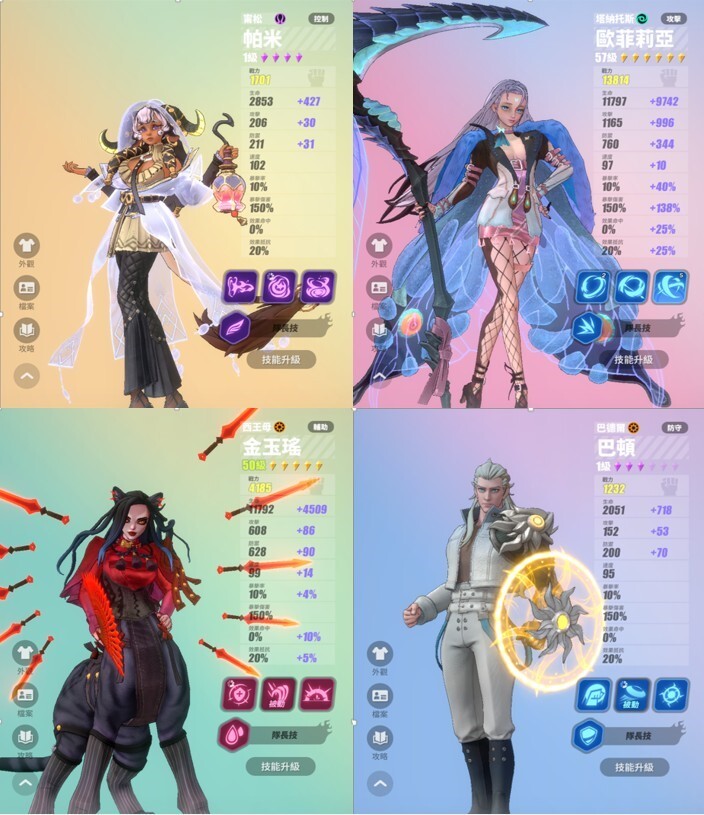 除此之外,遊戲角色還分為四種屬性與四種定位,屬性分別是灼熱、呼嘯、湧動、閃耀。