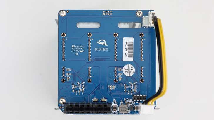 轉接板的另一面則可以看到四個 SATA 連接,下方兩顆 ASMedia ASM1062,一顆控制兩個 SATA。ASM1062 為 PCIe Gen2 x2 轉 SATA 的方案,而受限於 PCIe Gen2 x2 頻寬只有 1GB/s,加上其編碼方式為效率較低的 8b/10b,理論上實際傳輸速度只有 800MB/s。兩組 ASM1062 可以達到 1,600MB/s,這也是官方標示速度為 1,556MB/s 的原因。不過即便用上頻寬更大的方案,四顆 SATA 的極限大概也是 2,000MB/s 左右,並沒有完全吃滿 Thunderbolt 速度。但分析認為速度往上除了成本考量,可能也有 Thunderbolt 經過轉接後速度無法真實發揮,以及 Thunderbolt 優先提供頻寬給影響輸出而影響資料有效使用頻寬的顧慮。例如大多 M.2 PCIe Gen3 x4 SSD 實際速度也只有 2,000~2,800MB/s。而且還要考慮到 Thunderbolt 會優先將頻寬分給影像輸出,也就是在整個 Thunderbolt 匯流排上只要有影像輸出在運行,其他資料傳輸的頻寬就會被迫讓行而自降速度。因此若用上兩顆 ASMedia ASM1164(PCIe Gen3 x2 轉四顆 SATA),配上八顆 SATA SSD 在理論上吃滿其頻寬,實際表現速度可能也不會這麼理想,很可能僅比現在速度快一些而已。加上 OWC 算是非常早就推出這台 ThunderBay 4 mini,因此我覺得這樣的設計其實相當合理。此外大方向來說,接下來市場趨勢會持續朝 M.2 發展,應該不太有機會看到 OWC 或其他廠商推出 8 Bay 專門給 2.5" 的外接盒機種。