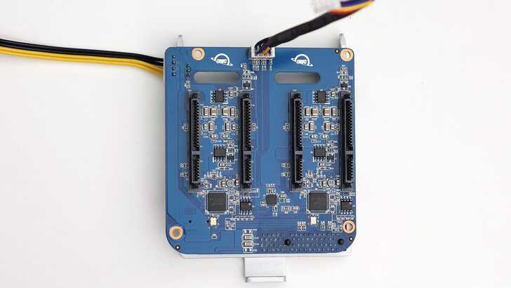 電源經由背板輸入後,並非用連接線,而是經由板子連接到轉接板。滿特別的,比較少看到消費級產品有這樣的設計。對於拆裝上會稍微困難一點,但正常也不會有人拆開來看啦。