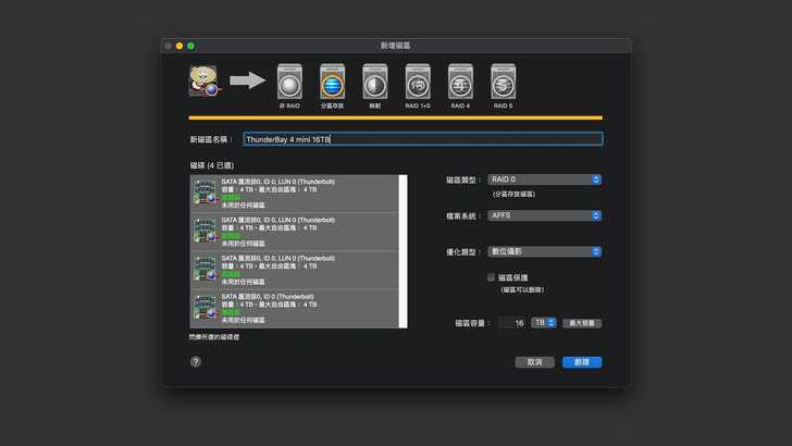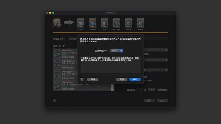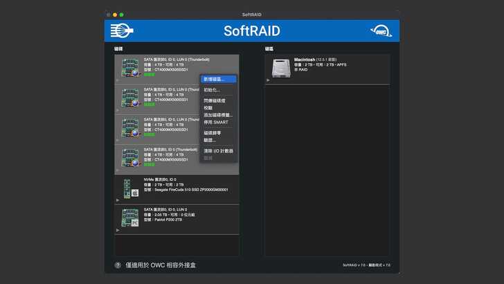 在 macOS 中的 Disk Utility 可以將磁碟陣列設為 RAID0 或 RAID1,但無法設定成 RAID5。而 SoftRAID 的強項在於,在 macOS 上能做到 RAID5,不過先以最快速的 RAID0 來測試。在 SoftRAID 中,將四顆磁碟同時選曲,並執行「新增磁區」。