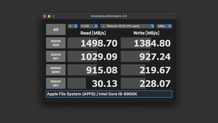 除了在 Intel CPU 的 Mac 上測試,也在 Apple Silicon 平台測試。使用 MacBook Air M2。Apple Silicon 的 Mac 在使用 Thunderbolt 外接裝置時,通常讀取速度是正常,但是寫入速度會降低到一半,約 1,000~1,500MB/s。而 ThunderBay 4 mini 極限 1,500MB/s 的速度,其實也差不多。不過實際能測到多少,還是實操看看。