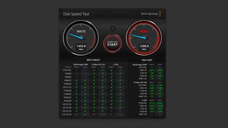 有趣的是,在 MacBook Air M2 上運行,讀寫成績還略好一點。以 Blackmagic Disk Speed Test 測試,檔案大小 5GB。寫入速度約 1,435MB/s,讀取速度約 1,298MB/s。