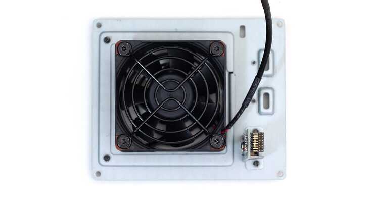 而滿有趣的是,常見 Thunderbolt 板子上同時會有電源輸入,讓電源控制與 Thunderbolt 晶片較近。ThunderBay 4 mini 是設計在轉接板上,電源輸入是右下角黑色接頭的排插。右上角則是輸出到 Thunderbolt 的電源,以及風扇控制接頭。