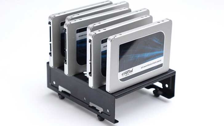 SATA SSD 部分選擇的是 Crucial MX500 4TB,不僅容量大、速度穩定、價格便宜、散熱好,實際運作時的溫度低,對於散熱上的壓力會比較小。不管是長時間待命使用或是追求靜音、改裝降低外接盒風扇速度,在溫度範圍內會有更多操作空間。這也是我這套組合選擇 SATA 而非 M.2 的原因,在 SATA SSD 本身發熱不高的情況下,MX500 在外接盒中有本錢挑戰完全被動的散熱改裝。而 OWC ThunderBay 4 mini 的托盤支架也滿特別的,採用中框固定的方式,且中框為鋁材質,重量意外地輕巧。