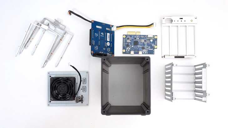 接著就是分解剖析其設計,上排由左至右是四個 2.5" Bay 的托盤、SATA 擴充板、Thunderbolt 板和內側前面板。下排則是後方風扇外殼、鋁擠型機身主體和 2.5" 硬碟籠。