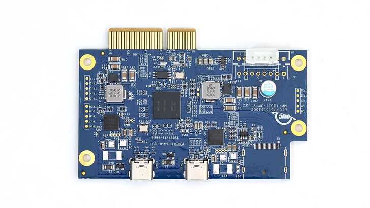 Thunderbolt 板子的部分,中心是 Thunderbolt 晶片,為 Intel JHL6540,以 PCIe x4 連接到另一張轉接板。比較特別的是,以 Thunderbolt 產品來說,他不支援 PD 充電,Thunderbolt 僅作為傳輸使用。其實也非常合理,與其因為加上 PD 充電而讓電源供應器更大、板子更複雜、溫度更高以及整體成本售價提高,還不如捨棄 PD 充電的功能,專職做好儲存和傳輸即可。畢竟對於桌機使用情境來說,本身就沒有額外供電的需求,即便對筆電來說,供電也不是非常必要,因此我認為 OWC 這樣選擇是比較好的。板子上看來原本也預留了其他 I/O,可能是標準大小的 DisplayPort 接頭。電源則是從轉接板供應,從 Thunderbolt 板子右上角白色接頭輸入。