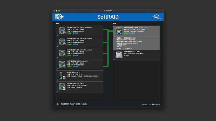 Mercury Elite Pro Quad USB3.1 Gen2,支援 USB-C 10Gbps。這些或許在其他品牌都還能找到競品,但 OWC 這款 ThunderBay 4 mini,應該是真的沒對手了,2.5" SATA 4Bay,傳輸介面 Thunderbolt。基本上就是 ThunderBay 4 的迷你縮小款,但因為這個迷你,將這款 ThunderBay 4 mini 切入到一個沒有競爭者的 2.5" 產品定位。再加上 OWC 自家 SoftRAID 的 RAID5 功能,打造強硬的軟硬體壁壘,讓其他品牌難以撼動打入 Mac User 市場,實在高明。