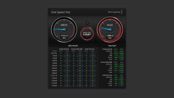 以 Blackmagic Disk Speed Test 測試,檔案大小 5GB。寫入速度約 1,121MB/s,讀取速度約 1,286MB/s。