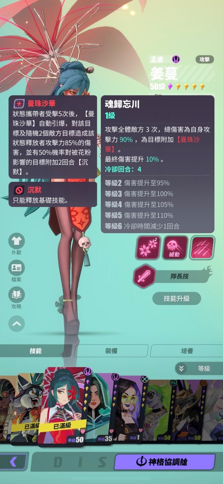 在主線劇情關卡中,敵人基本上都是5人,且敵人也吃【曼珠沙華】的沉默效果,所以孟婆在主線也是強勢角之一!