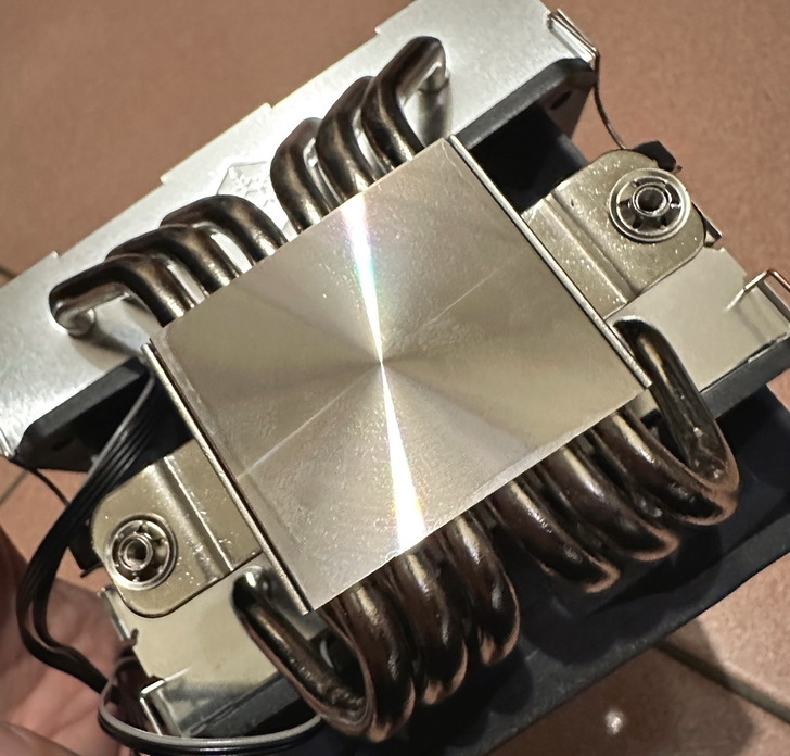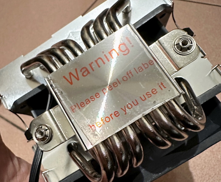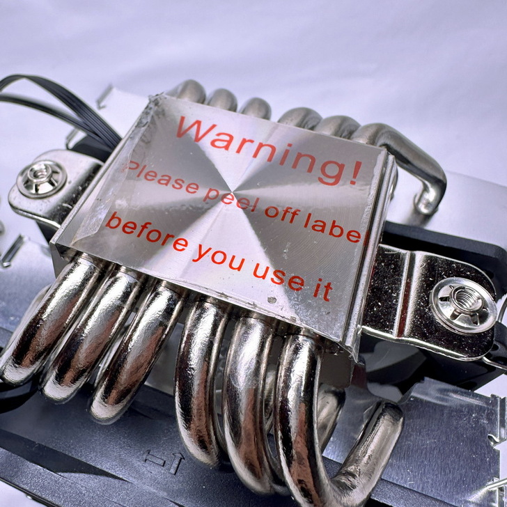 Hydrogon D120 ARGB底部 CPU接觸面有貼著一層膠膜,可以看到斗大的六條純銅熱導管。