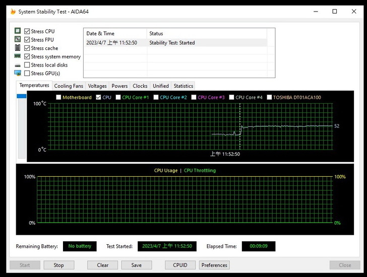 燒機大約九分鐘下來,CPU溫度穩定維持在49℃~52℃,風扇在燒機時也幾乎聽不到什麼風切聲。
