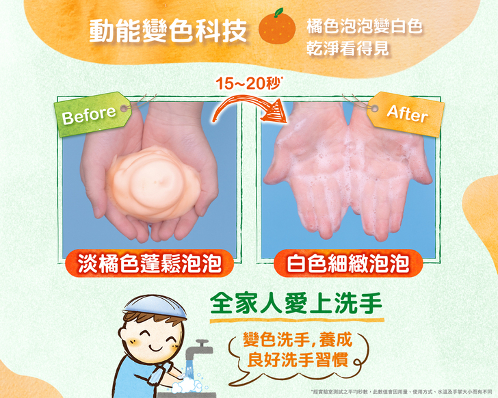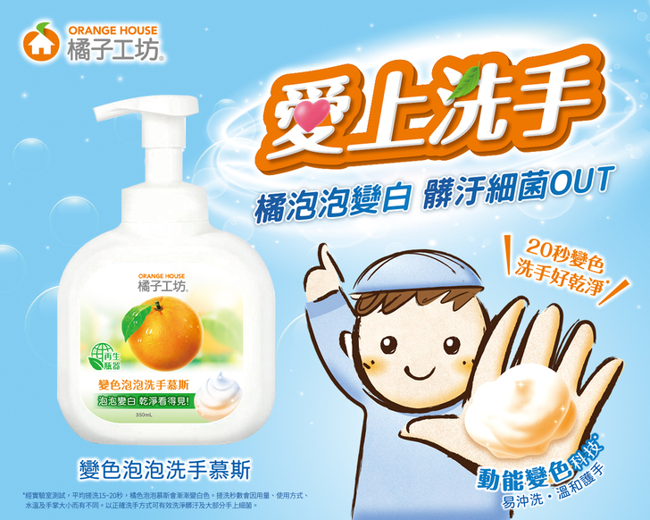 為了讓孩子自主養成良好的洗手習慣,即便父母不在身邊也能注意手部衛生,知名家用清潔品牌橘子工坊推出「變色泡泡洗手慕斯」,利用獨特動能變色科技,壓出搓揉15至20秒,綿密的橘色泡泡會逐漸變成細緻白色泡沫,而小分子泡沫則可在變色的這段期間包覆住細菌髒汙,完整洗淨手部;同時對父母來說,也能藉此教育小朋友「橘泡泡變白,乾淨看得見」,讓洗手過程充滿樂趣,進而鼓勵孩子愛上洗手!