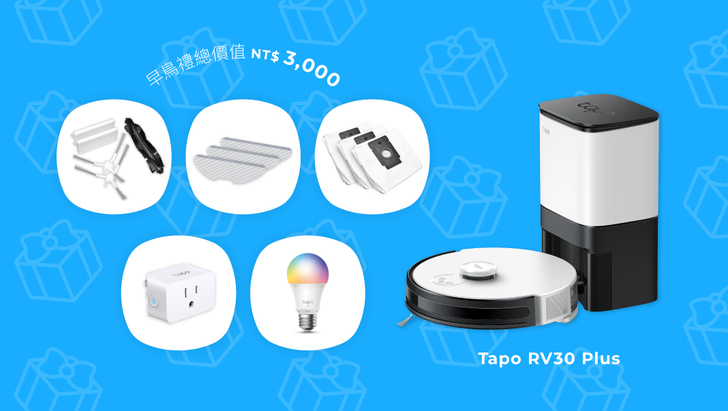 TP-Link Tapo RV30 Plus 4/14於蝦皮商城首賣,其餘通路陸續於4月底開賣,RV30 Plus建議售價12,999元,4/30前即享早鳥優惠贈送價值NT$3,000元大禮包,包含Tapo掃地機器人備件套組(註 )、Tapo掃地機器人塵袋(3入)、Tapo可洗拖布(3入)、Tapo P125M智慧插座以及Tapo L530E智慧燈泡,就要給你超值組合;不僅如此,TP-Link更要挑戰市場最高CP值RV30建議售價NT$9,999元,即日起至4/30也享早鳥優惠,贈送價值NT$2,000好禮含Tapo掃地機器人備件套組、Tapo可洗拖布、Tapo P125M智慧插座,小資族也能輕鬆享受解放雙手的智慧新生活!