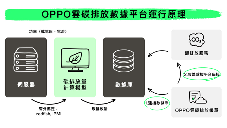 為全面打造綠色智慧引擎,OPPO智慧雲(大灣區)數據中心還打造了OPPO 自研雲類資源碳排放數據平台,完整收集並展示全球自研雲機房及自有伺服器相關的碳排放數據,並推出OPPO雲碳帳單服務,每月推送給所有雲用戶,幫助他們了解自身的碳排放情況,尋找更綠色的成長方式。