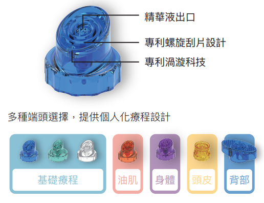 HydraFacial海菲秀所擁有的一系列特殊Hydro Peel端頭,每種端頭都有專利螺旋刮片設計搭配負壓技術等特殊功用,如去角質、深層清潔與潤澤肌膚,同時能使精華液注入過程產生渦漩效果,讓髒污脫落的同時給予肌膚滋潤與抗氧化防護。