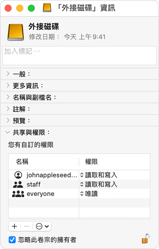 如果您的外接硬碟的檔案系統是支持Mac系統讀寫的,那麼您可能需要變更外接硬碟的權限以修復它。