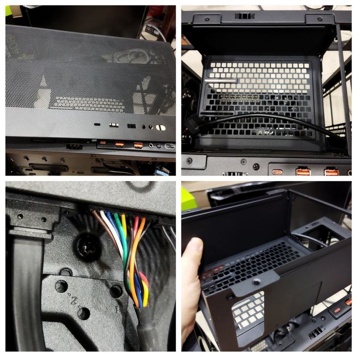 再來是電源架,要先拆下前面板,架子上方有三顆螺絲,加上側邊前置IO線那邊有顆螺絲,一共四顆,要先轉下螺絲才能將架子取出