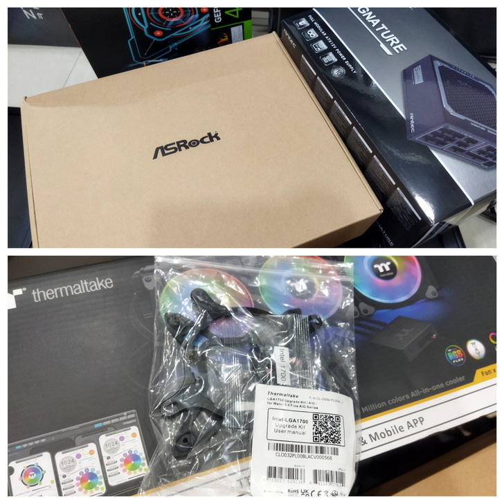 準備上機,很多零件都已拆封,有些東西之前也分享過了, TT水冷這顆還特別去申請了LGA 1700扣具……,近年來Intel i9的盒子造型都很特別,朋友想要就送他了,所以我連盒子都沒了 @@”