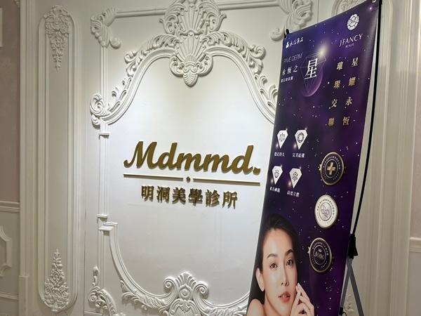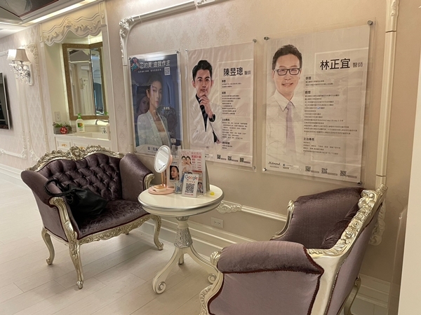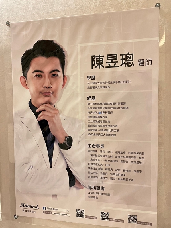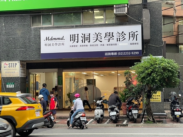 白底黑字招牌寫著『光療雷射、美容保養、玻尿酸微整、除疤淡斑』
