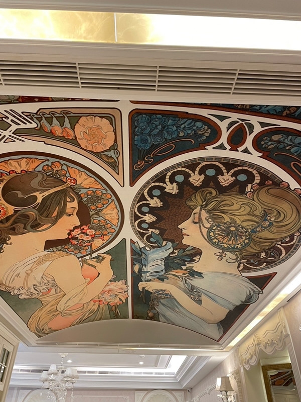 接待區天花板上彩繪著慕夏風格端莊優雅女神