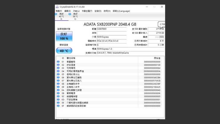 上圖為 ADATA XPG SX8200 Pro 2TB 基本資訊。這次測速以 Intel 測試平台來執行,測試環境是未貼上原廠散熱片,並且無加裝其他散熱片的情況下來測試 SX8200 Pro。整機規格如下: