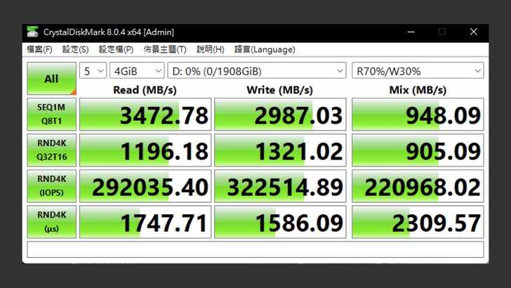 在 CrystalDiskMark 中,設定測試為五次 4GiB。最佳效能的設定下,循序讀取速度接近官方標示的 3,500MB/s,有 3,472MB/s。循序寫入也與官方標示的 3,000MB/s 非常靠近,來到 2,987MB/s。在混合效能方面,表現就與前兩者有些落差,有 948MB/s。隨機 4K 的讀取則為 1,196MB/s,寫入為 1,321MB/s。最後,隨機 4K IOPS 平均落在 290K~320K IOPS 之間。