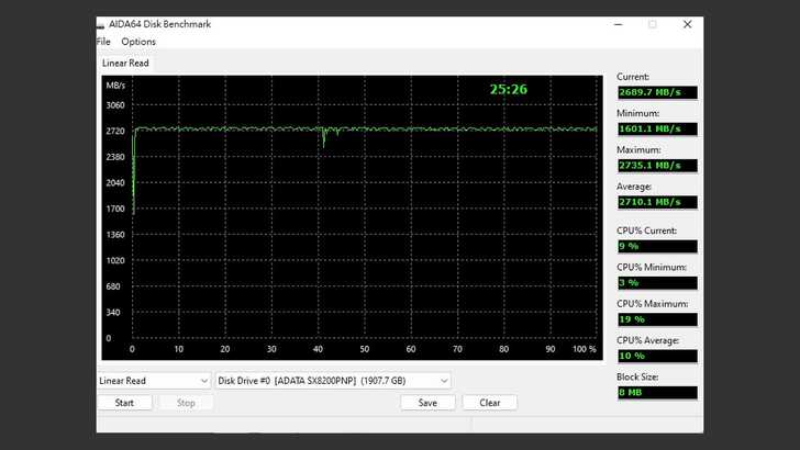 在 AIDA64 Disk Benchmark 中的 Linear Read,速度基本都穩定的維持在 2,700MB/s 左右,中間沒有嚴重的下降情形。全碟讀取平均值為 2,710MB/s,容量有 1907.7GB。