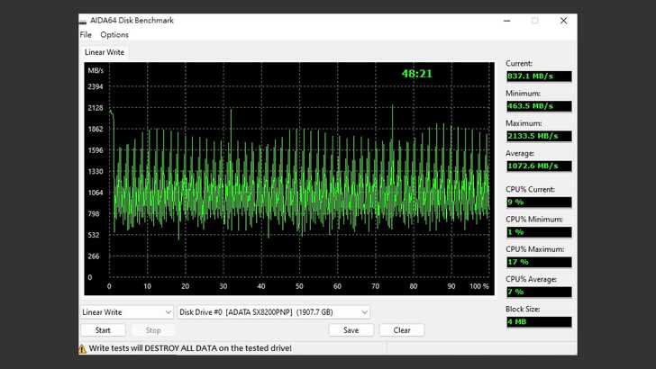 在 AIDA64 Disk Benchmark 中的 Linear Write,測試結果浮動較大,看起來也滿神奇的,呈現一定規律的起伏。最快可以到 2,133.5MB/s,最慢速度為 463.5MB/s,兩者有一段差異,但大部分都落在 1,000MB/s 左右,平均為 1,072.6MB/s。