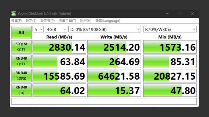 接著一樣是 CrystalDiskMark 中,設定測試為五次 4GiB,改為真實世界的設定。循序讀取速度是 2,830MB/s,而循序寫入則為 2,514MB/s,表現還不錯。混合讀寫反倒沒有像最佳效能落差這麼大,依然有 1,573MB/s。在隨機 4K 讀寫速度方面讀取約為 64.02µs,寫入速度約 15.37µs。