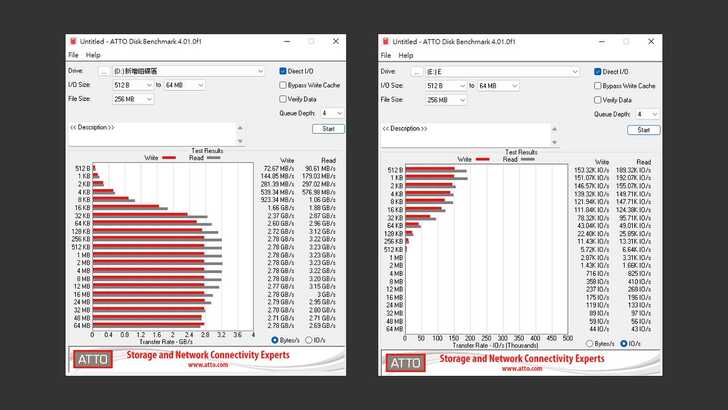 在 ATTO Disk Benchmark 中,讀取基本上落在 2.80~3.23GB/s,在 16MB 開始有降低趨勢。寫入則很穩定的維持在 2.37~2.78GB/s 區間,且大部分都在上限,一直到 64MB 還是維持一樣的速度。4K 大小讀取為 149.71K IOPS,寫入為 139.32K IOPS。