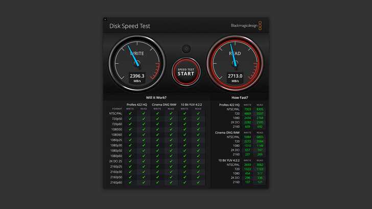 以 Blackmagic Disk Speed Test 測試,檔案大小 5GB。寫入速度約 2,40MB/s,讀取速度約 2,700MB/s。