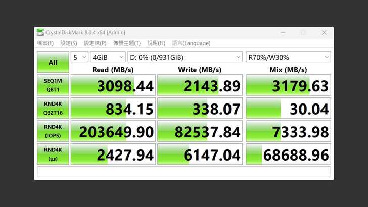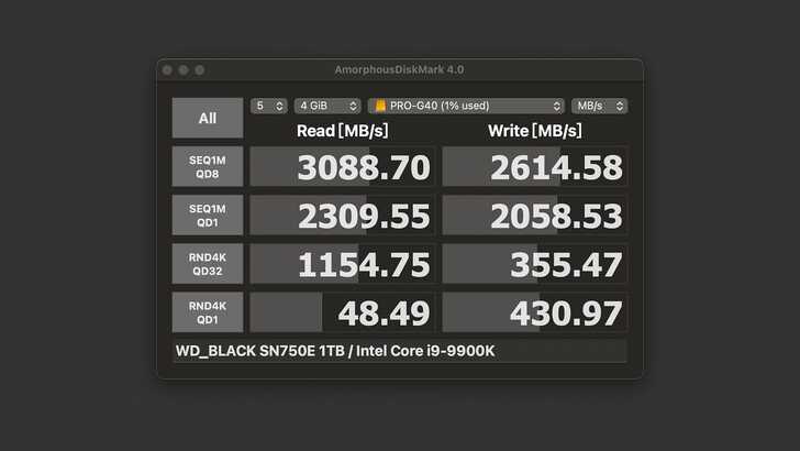 以 AmorphousDiskMark 測試,設定為五次 4GiB。循序讀取速度超過 3,000MB/s 大關,達到 3,088MB/s,著實驚人。寫入速度則有 2,614MB/s。即便是在較接近日常使用情境的 QD1 測試條件下,循序讀取依舊有 2,309MB/s,循序寫入也有 2,058MB/s。以 Thunderbolt 外接 SSD 來說,表現相當出色。