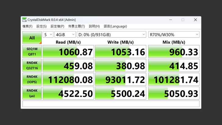 除了在 Thunderbolt 協議下測試,也以 Windows Desktop 測試了其在 USB-C 協議下的速度。測試方式為使用隨附的 Thunderbolt Cable 連接到主機板上支援 USB3.2 Gen2 10Gbps 的 USB-C。在 CrystalDiskMark 中,設定測試為五次 4GiB。最佳效能的設定下,循序讀取速度 1,060MB/s,循序寫入速度 1,053MB/s。皆超出官方標示的「USB:讀取 1,050MB/s,寫入 1,000MB/s」