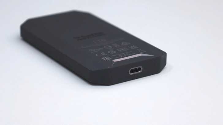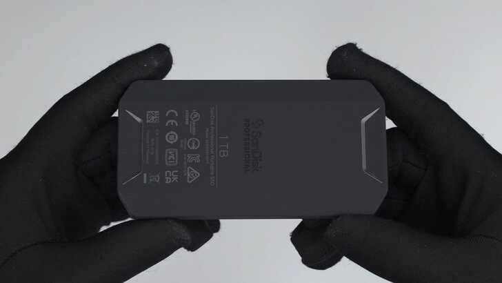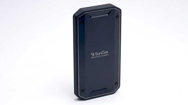 整體外觀相當陽剛,質感也很不錯。正面有 SanDisk Professional 的 Logo,四個角落有內六角螺絲固定。不過嘗試拆下邊緣四顆螺絲,意圖打開外殼未果,無法一窺其內部方案和散熱方式。除了正面這片是硬的塑膠外殼,其餘五面皆有橡膠材質包覆。而從正面也可以發現邊緣有銀色線條,並非裝飾,而是整個外接盒的金屬外殼,被橡膠包覆著。具備 IP68 等級的防水防塵能力。另外官網也標榜 3 公尺防摔保護及 4,000 磅抗壓功能,我想也跟其外部包覆著橡膠,基本緩衝了撞擊力,以及本身鋁金屬機身,維持內部的結構有關。