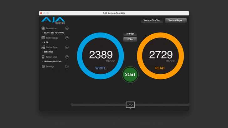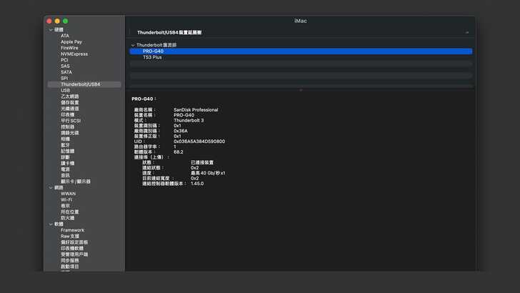 在 Mac 中,可以看到 PRO-G40 型號連接在 Thunderbolt 匯流排之下,且以 40Gb/s 運行。測試平台使用 Apple iMac 27 5K 2019,CPU 為 Intel Core i9–9900K。