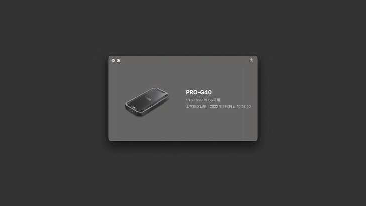 不管是在 Finder 還是 Preview 中,都可以看到圖示是 PRO-G40 的專屬 icon。第一次連接上電腦上,以為自己失憶了,居然提前將外接 SSD 格式化好了?後來看了一下官方資料,其實不是失憶,是因為 Western Digital 預設便將其設為 APFS 的檔案系統。可見對於這款產品,可能認為 Mac User 是其主要 TA。當然對於 Windows、Linux 使用者來說還是可以用,只是需要多一個步驟換為支援的系統,例如:exFAT。因此這次測試時,在 Mac Platform 會使用 APFS,在 Windows Platform 則使用 exFAT。