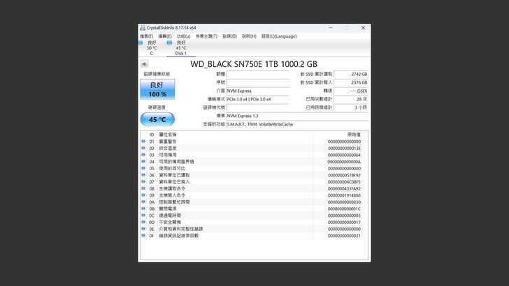 首先在 CrystalDiskInfo 中,可以看到 SSD 辨識出為 WD_BLACK SN750E 1TB,運行在 PCIe Gen3 x4。