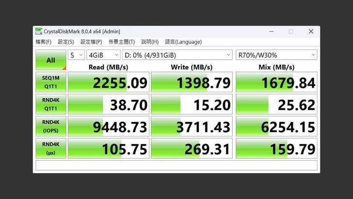 接著在 CrystalDiskMark 中,同樣設定測試為五次 4GiB,改為在真實世界的設定。循序讀取為 2,255MB/s,循序寫入則為 1,398MB/s。可以看到在較貼近日常使用的測試條件下,成績有下降一些,其中寫入速度差異會較大。不過終究要考慮到其是外接、經過 Thunderbolt 轉接的 SSD,而不是內建於桌機內的 M.2 SSD。