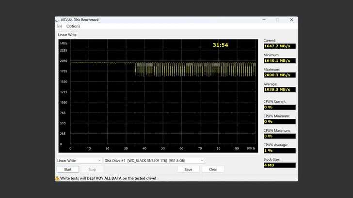 在 AIDA64 Disk Benchmark 中,測試 Linear Write。可以看到前 13% 在接近 2,000MB/s 穩定寫入,13%~33% 稍微低一點,不過看起來也相當穩。33% 推估是快取容量耗盡,因此寫入速度就有所起伏,在 1,600~2,000MB/s 之間來回。不過基本上速度表現都還是不錯,最終平均能達到 1,938MB/s,也是逼近 2,000MB/s。也讓其 1TB 大小僅在半小時出頭就全碟寫入測試完成。