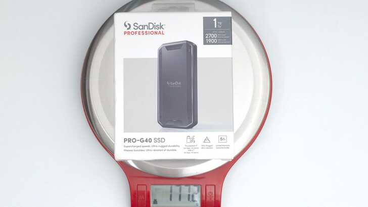 SanDisk Professional PRO-G40 SSD 盒裝重量約 177.2g。包裝左上角是 SanDisk Professional 的 Logo,相較 SanDisk 是更偏向專業工作使用的產品,因此產品定位、規格、耐用性上都會更強,不過價格也會更高一些。右上角標示著容量及讀寫速度,讀取可達 2,700MB/s,寫入可達 1,900MB/s。右下角有三個特點標示,同時支援 Thunderbolt 3 和 USB-C 10Gbps、超級堅固耐用的設計還有五年保固。
