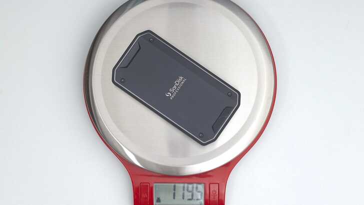SanDisk Professional PRO-G40 SSD 尺寸,長度 110.75mm x 寬度 57.80mm x 厚度 11.90mm。官方標示的尺寸「111mm x 58mm x 12mm」算是相當精準,實測都沒有超過官方標示。官方宣傳上沒有特別強調這個特點,就是其非常纖薄。以手上十顆左右 Thunderbolt SSD 競品來比較,PRO-G40 是目前量產公開發售的產品中,最薄的 Thunderbolt External SSD。