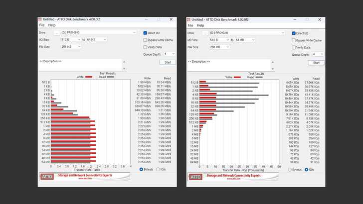 在 ATTO Disk Benchmark 中,這邊反而是寫入速度比較快,達到 2.25GB/s,讀取 1.99GB/s,就是沒有達到二字頭。讀取速度的 IOPS 表現不錯,而寫入速度就與讀取的有些差距。