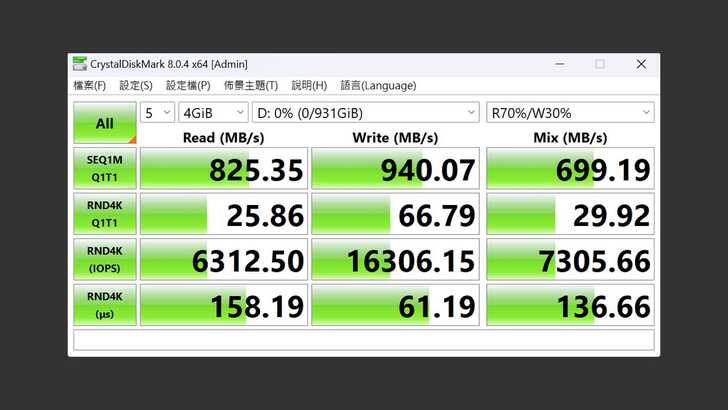 最後在 CrystalDiskMark 中,同樣設定測試為五次 4GiB,改為在真實世界的設定。循序讀取為 825MB/s,循序寫入則為 940MB/s。
