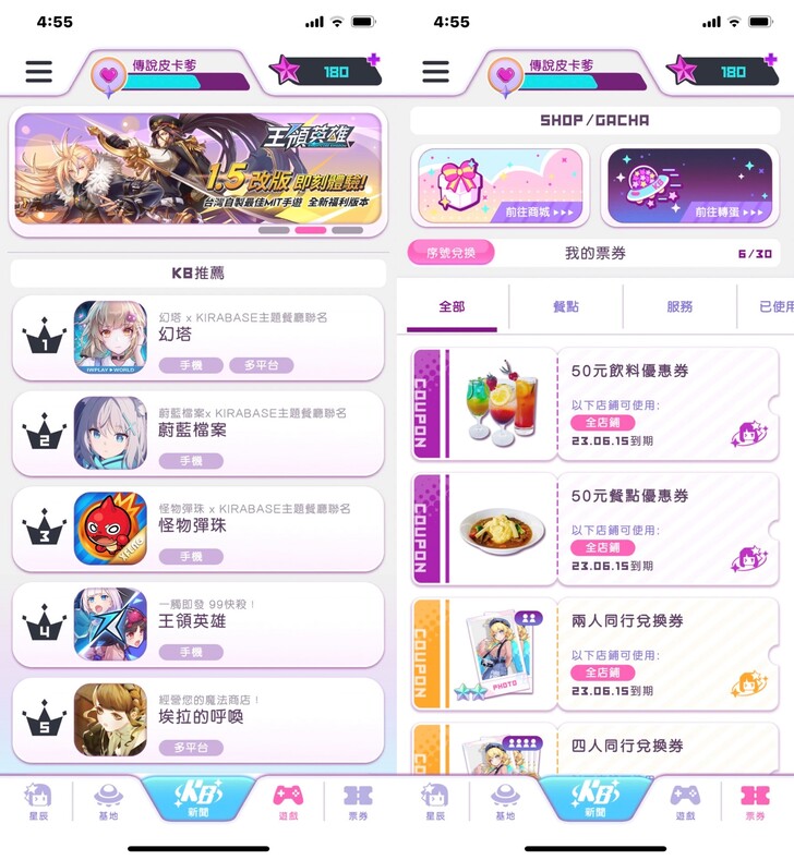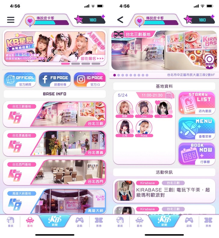 全新推出的KIRABASE APP,以『零距離偶像互動』為主打,用戶可傳送鼓勵和留言與心儀的星辰偶像互動,並可得到偶像的直接回覆,創造出粉絲和偶像之間豐富的交流。且這款應用程式還整合了世界級動漫IP和遊戲的第一手訊息,會員可從線上領取各種限定票券,再到實體空間消費。從拍照簽繪到AI變裝,從線上餐券到線下品嚐,從動漫現場到遊戲下載,KIRABASE已成功實現讓玩家永不登出的Online Merge Offline體系。