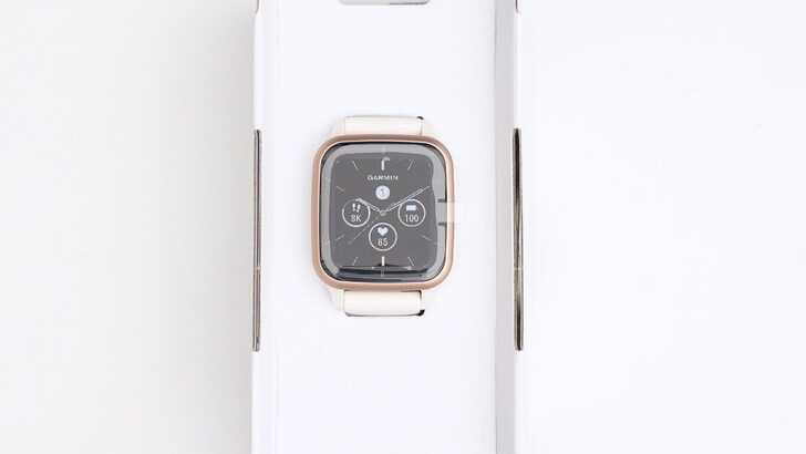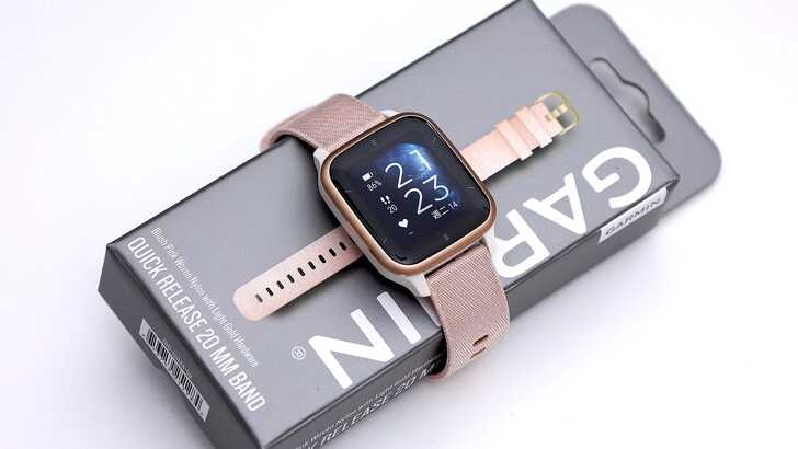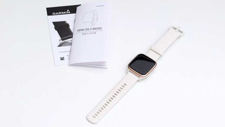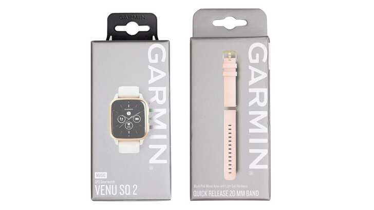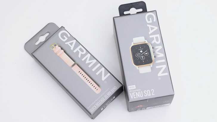 這次選擇的 Garmin Venu Sq 2 — Music Edition 象牙白。除了本身隨附的錶帶,又額外加了一個 Quick Release 錶帶,款式是粉紅尼龍織帶暨淡金色錶扣。盒裝以灰色紙盒包裝,包裝簡單。