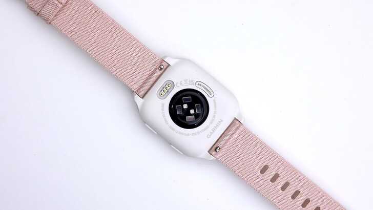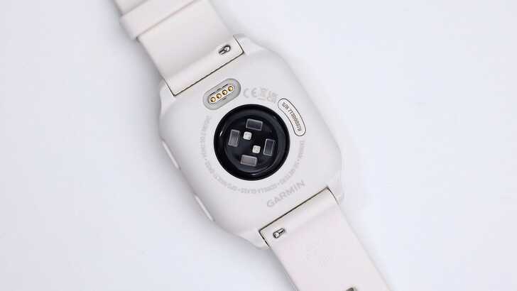 Venu Sq 2 背面中心黑色圓形部分,是 Sensor 的區域,為 Garmin 光電心率感測器。周圍四顆 Senser 以 90 度排列,中間兩顆 Senser 發出綠光。透過反射的綠光多寡,判斷血紅素,進而分析血液含氧量。也透過光電二極體去偵測光體積的變化數據,藉以計算出心跳速率。