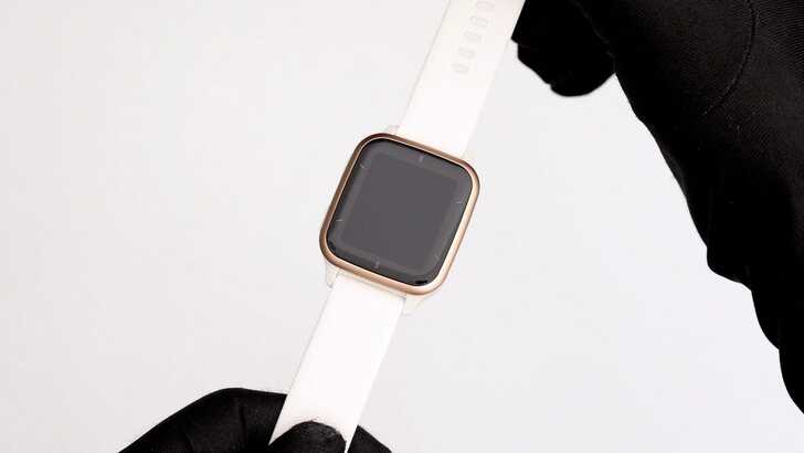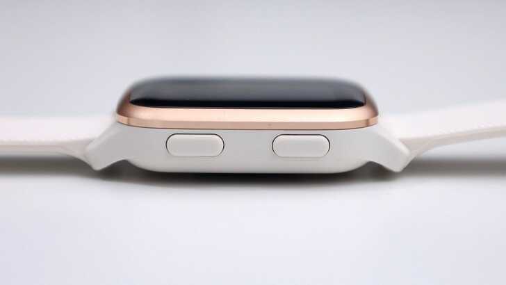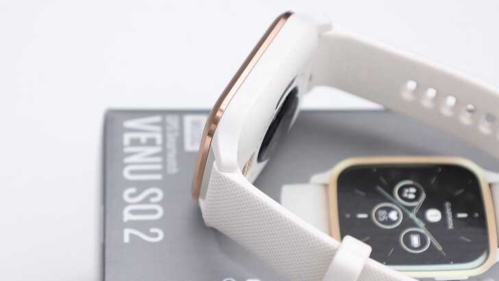 側邊可以更直觀地看到,螢幕玻璃的圓潤過度,一路到旁邊的金色鋁合金錶圈完美銜接。頂部這片是 Corning Gorilla Glass 3 的玻璃,防刮效果真的很不錯,使用一個多月,肉眼都還看不到任何刮痕,超讚。相較以往用的便宜穿戴式裝置,用塑膠螢幕使用一兩天就有肉眼可見的刮痕。30 幾天下來,Venu Sq 2 錶面的表面依舊光滑,且仍有一定的疏油能力。這對重度仰賴觸控的手錶來說,使用體驗真的很棒。白色部分的錶殼則是塑膠材質。側邊兩個按鍵也是塑膠材質,按壓手感不生硬,有一點彈性回饋。