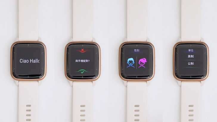 第一次設定,就可以感受到其引導畫面在幫助使用者學習其 UI 邏輯。首先會詢問是否要與手機配對,接著會詢問性別,以及選擇單位:英制、公制。然後滑動選擇出生年月日,還有身高和體重。